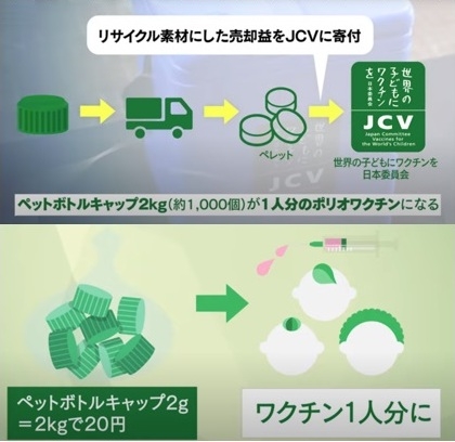 回収しましたボトルキャップは、NPO法人世界の子供にワクチンを日本委員会(JCV)へ寄付いたしております。