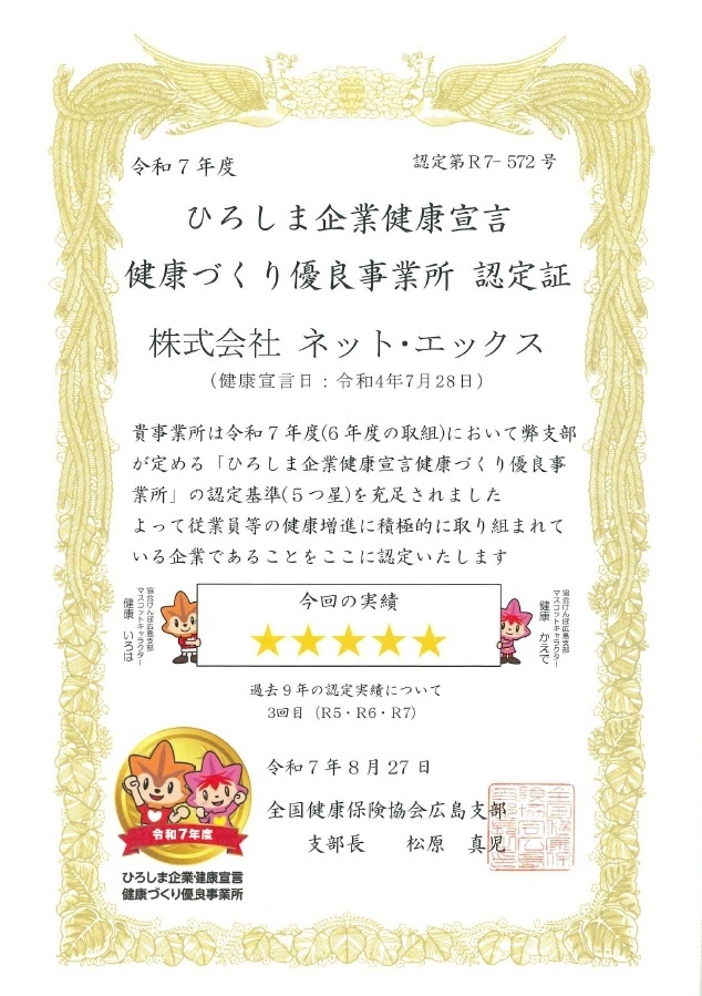 『ひろしま企業健康宣言 健康づくり優良事業所』